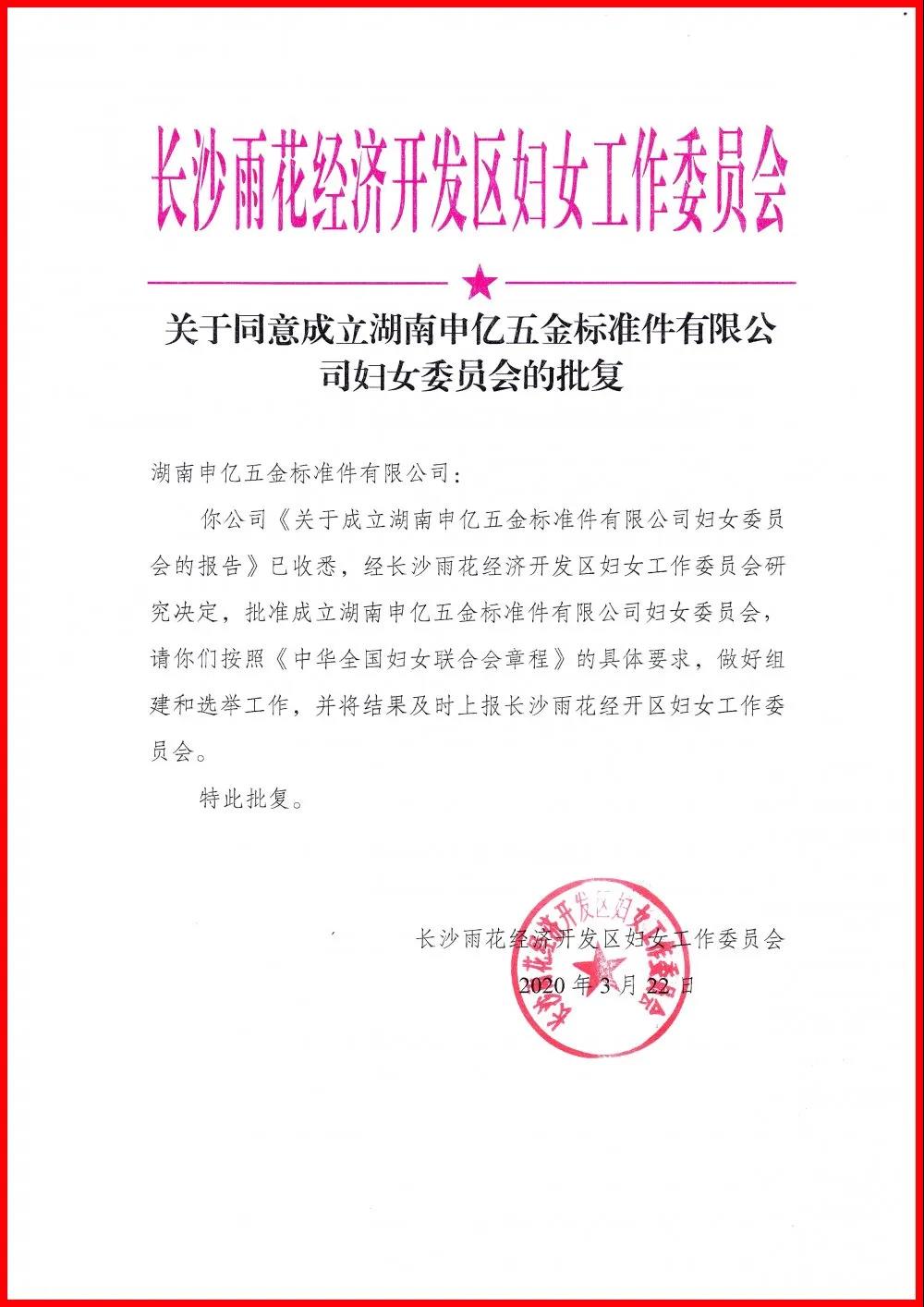 2020年4月10日上午,經長沙雨花經開區婦工委批復,湖南申億五金標準件有限公司婦女委員會正式成立。長沙雨花經開區企業黨委專職副書記、婦工委主任戴江南及申億公司董事長王凱波出席成立大會并講話,長沙雨花經開區企業黨委武才源、湯穎琳出席會議。會議由申億公司政府事務總監張紅明主持。